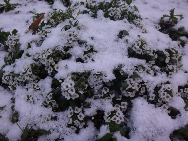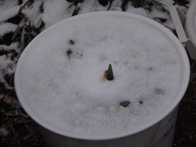 幼稚園に早めに来てくれた先生に、滑らなかったかと尋ねたらゆっくり運転しましたという返事。10時過ぎても運動場に雪が残っているほど冷えたのは久しぶりです。写真は年長さんのチューリップです。この寒さにより花芽ができるそうです。