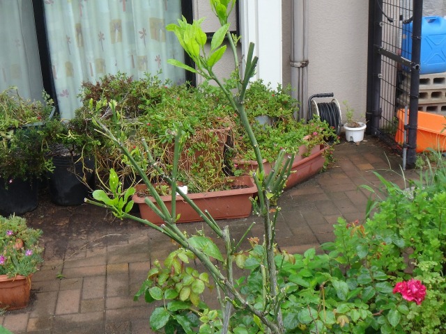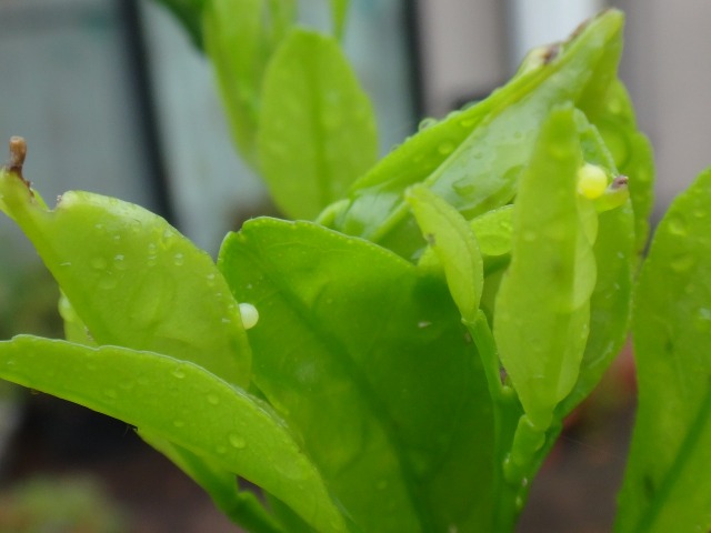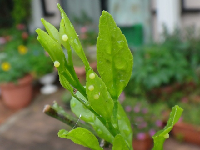 アゲハチョウの幼虫に葉っぱを食べつくされたミカンの木から、新たな葉っぱが出てきたことはご報告しましたが、本日の発見をご報告いたします。この丸いのはアゲハチョウの卵かもしれません。全部孵化したら8匹。別プランターに夏ミカンの種から生えた苗木がありますので、移住させてあげます。